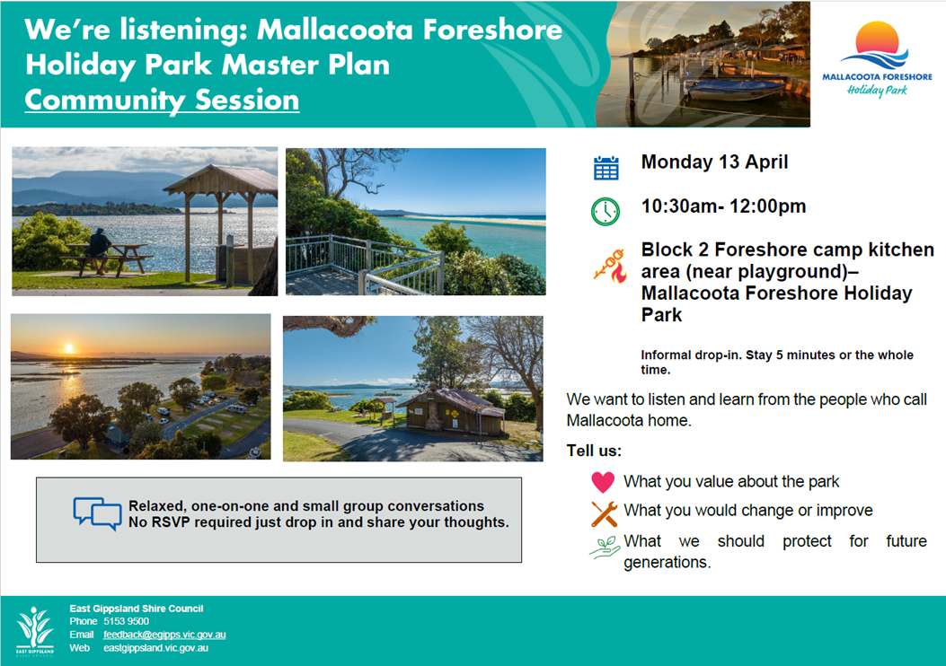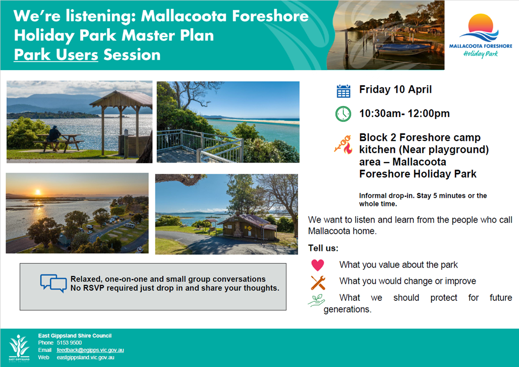 Thank you to everyone who took part in the Mallacoota Foreshore Holiday Park engagement. Your feedback is helping shape the future Master Plan.